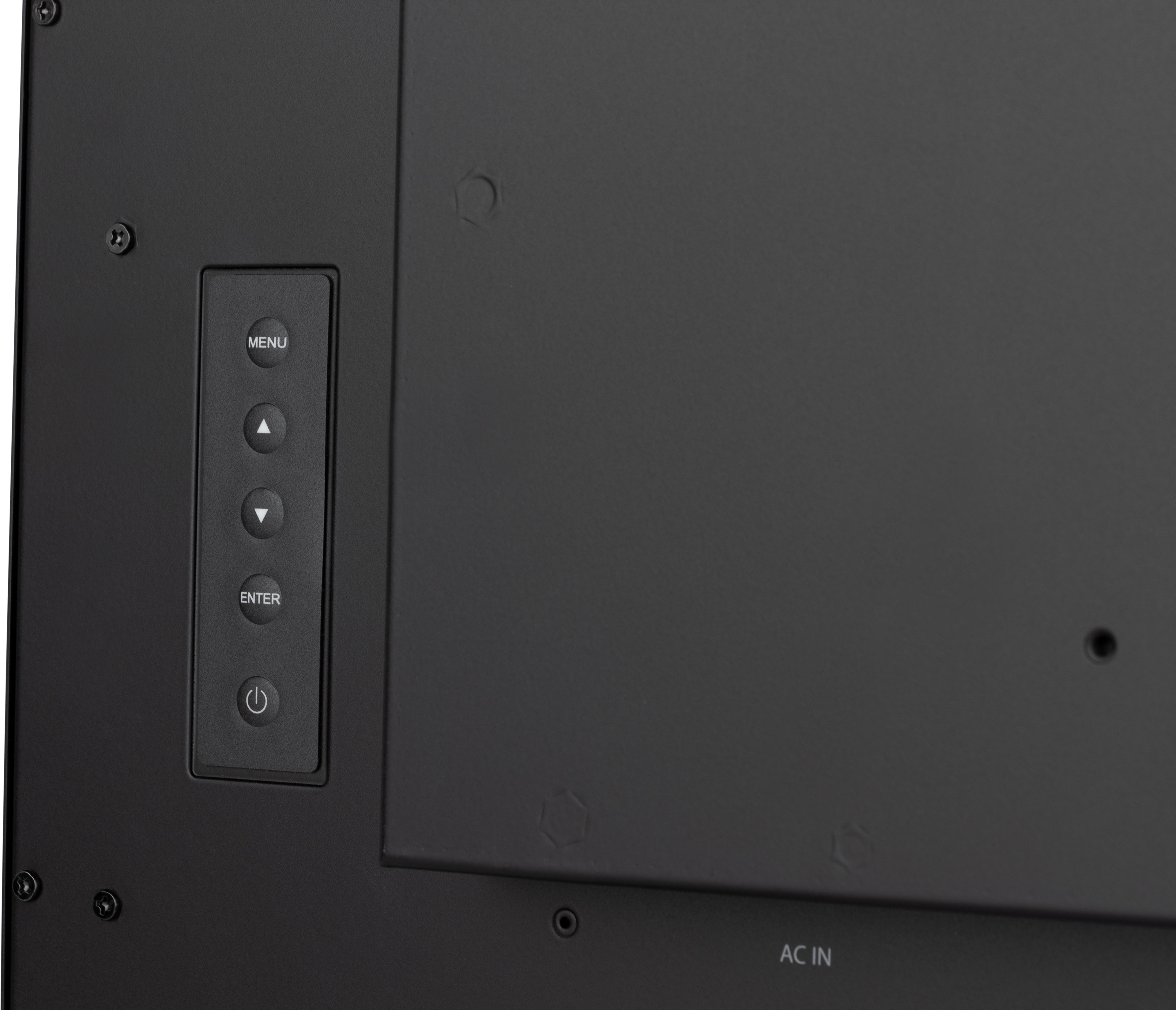 Bedienfeld: Menu, Scroll up/ Eco, Scroll down/ Volume, Enter/ Input select, Power